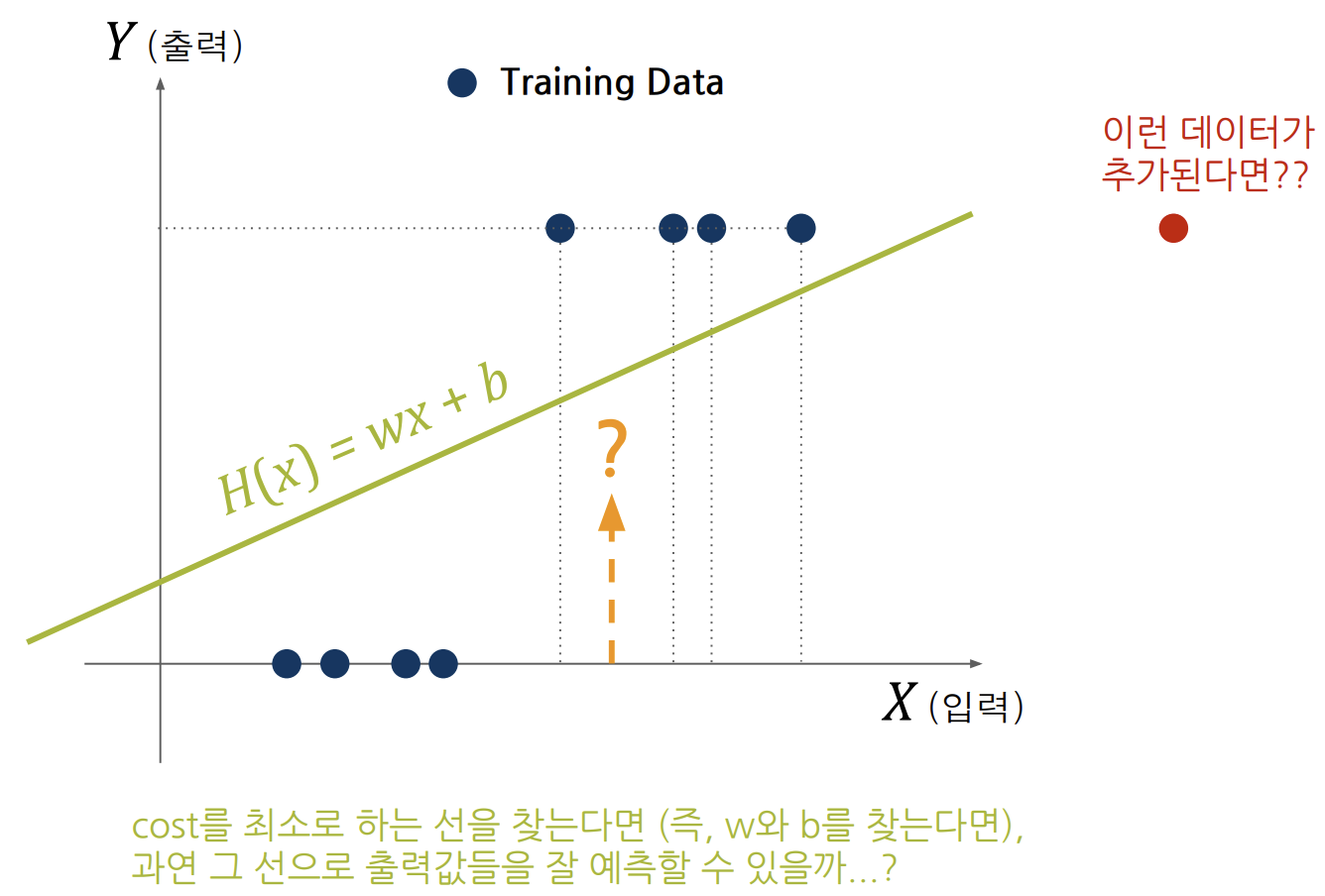 - 선형 회귀(Linear Regression)에서는 가설(H(x))로 직선(Wx+b)을 사용한다.