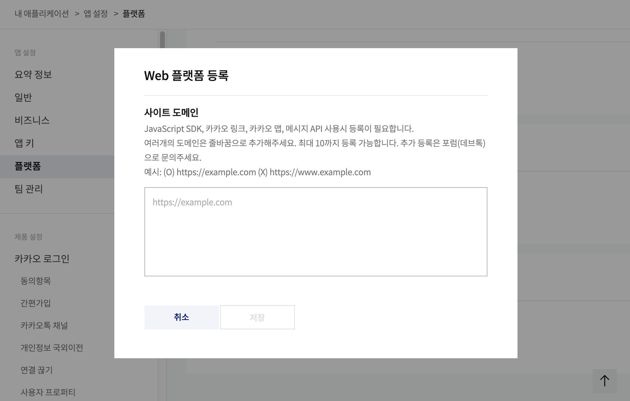 앱 설정 > 플랫폼 > Web 플랫폼 등록 > 사이트 도메인 등록 (예:http://localhost:8080)