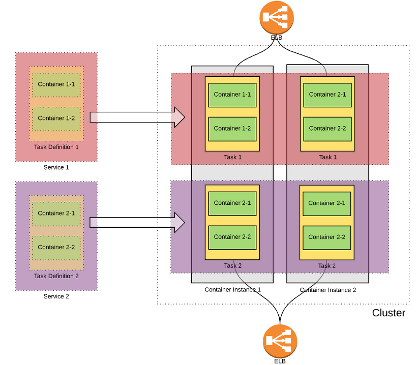 Cluster, Container Instance와 Task, Service의 관계를 도식화 시켜 보면 아래와 같다.