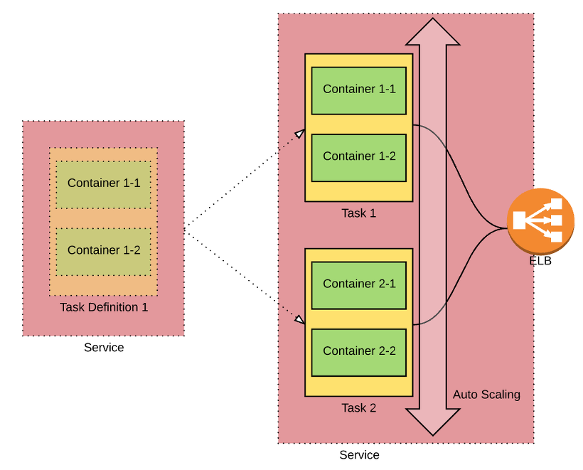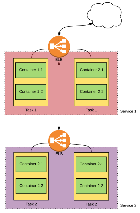 즉, service 사이의 통신은 ELB를 통해 통신을 함으로서 task의 life cycle 을 유연하게 관리할 수 있게 만든 구조이다.