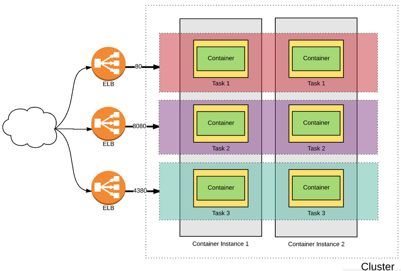 아래와 같이 Container instance 는 두대이지만, 각각 다른 포트를 사용하는 service를 여러 개 올려 컨테이너 집적도를 높일 수 있다.