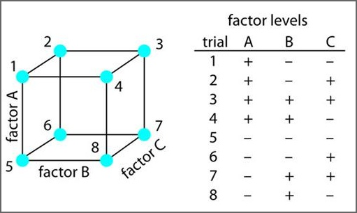 - 예를 들어, 위 그림처럼 3개의 인자가 있고 각 인자마다 2개의 수준이 있다면