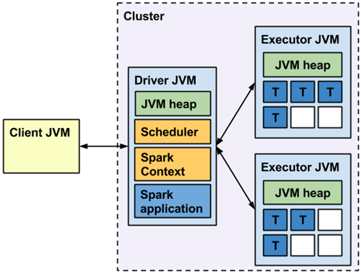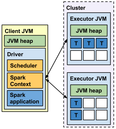 - 애플리케이션을 제출한 Client 머신(예를 들어, 쓰고 있는 노트북)에서 애플리케이션을 위한 Driver Program이 실행되며