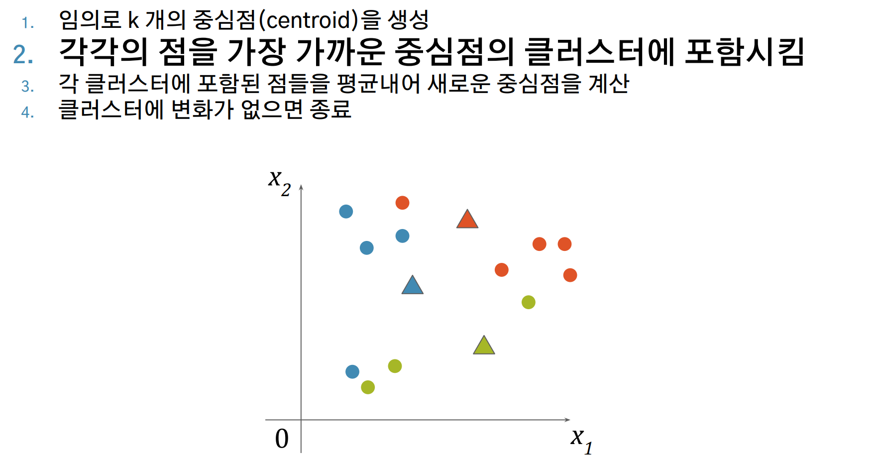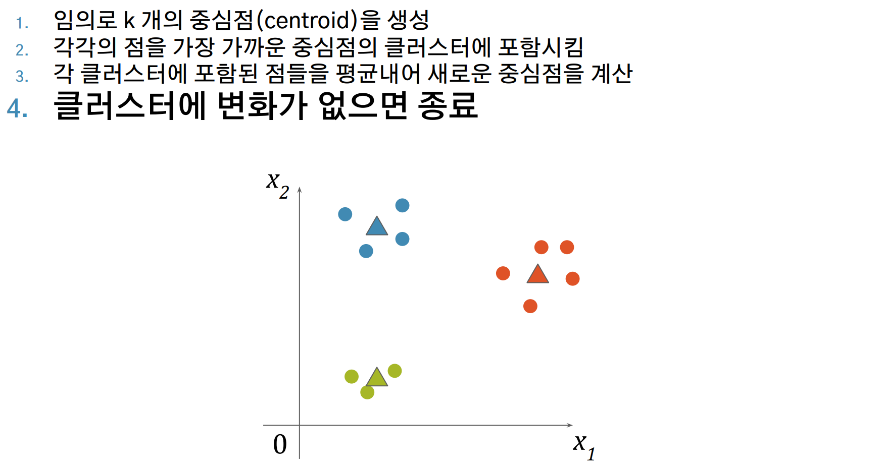 - 2번 ~ 3번을 반복하며, 클러스터에 변화가 없으면 종료합니다.
