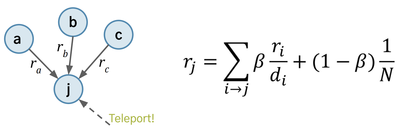 하지만, PageRank Score 오리지널 버전에선, Random Teleport 를 통해, 이웃노드 뿐만 아니라 랜덤한 확률로 다른 노드의 점수 또한 받는다.
