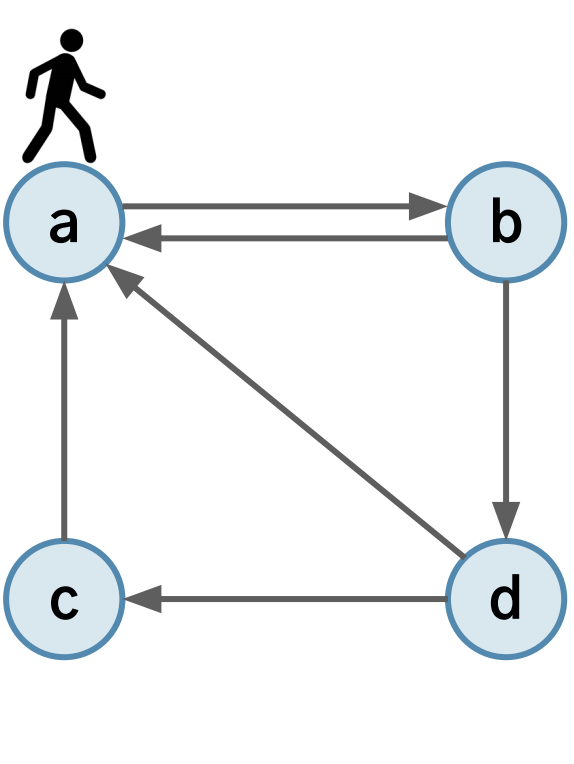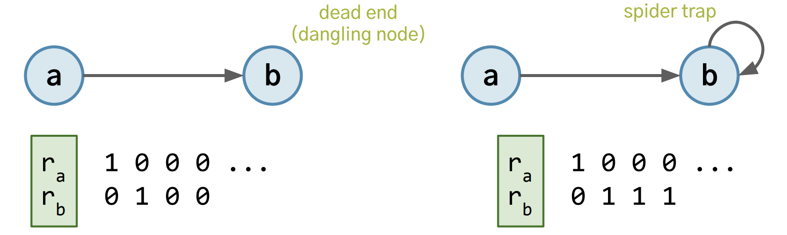 - a 와 b 가 서로 참조한다면 PageRank score 가 수렴하지 않는 경우가 발생한다.