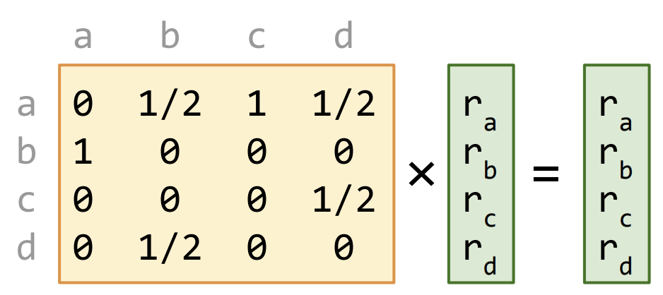 - 4) 각 노드가 받은 점수의 합은 노드가 적을 경우엔 연립방정식을 통해서 구할 수 있지만, 보통 노드가 많으므로 행렬 곱셈을 통해 구할 수 있다.