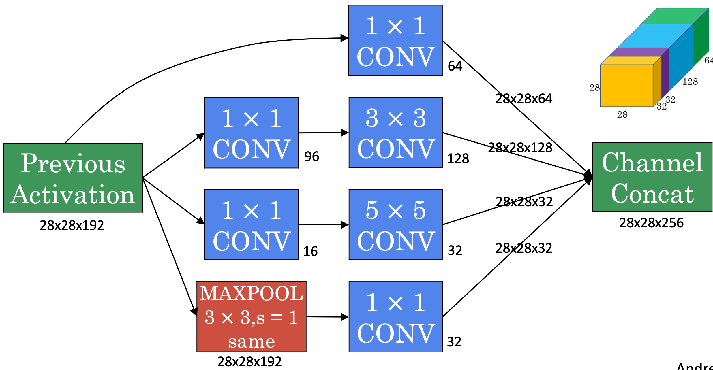 - 위 그림에서, (28, 28, 192) 입력 볼륨은 Inception Module을 통해 (28, 28, 256) 출력 볼륨을 갖게 됩니다.