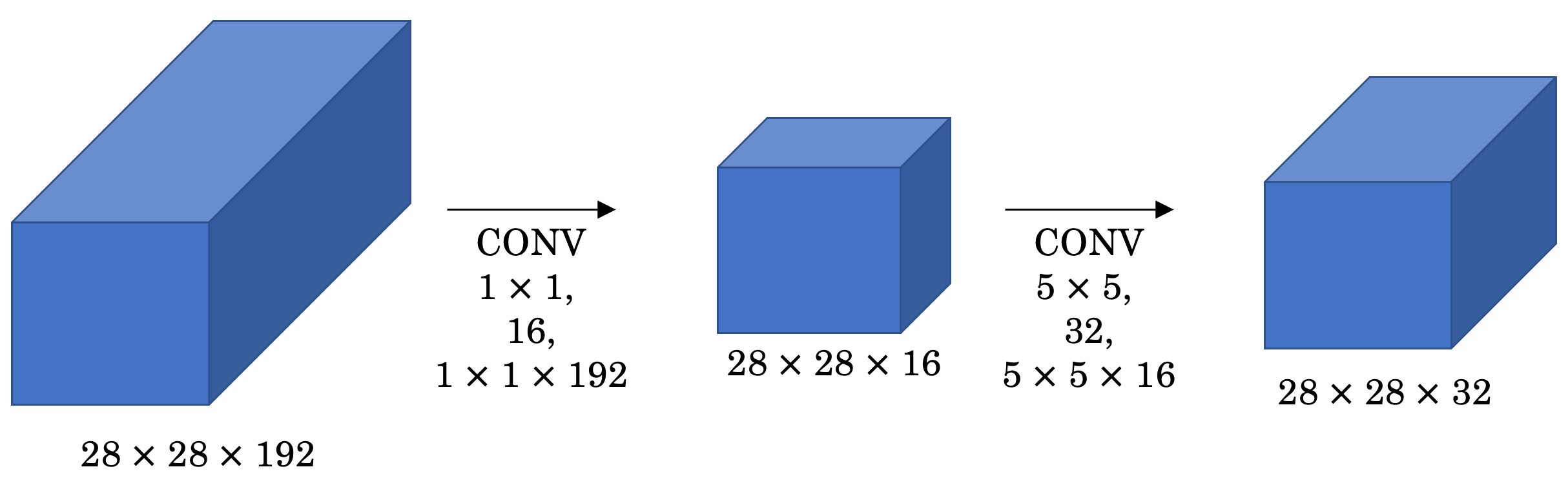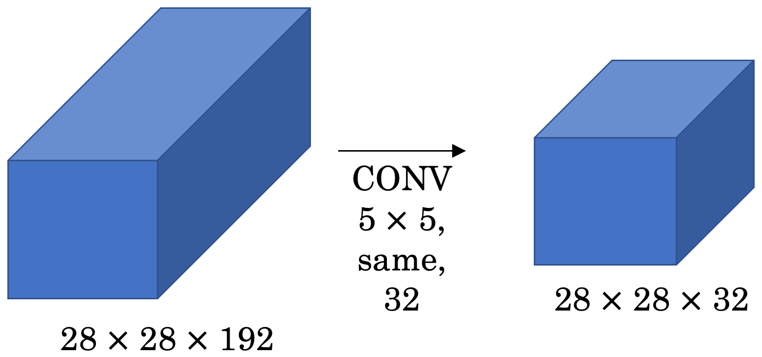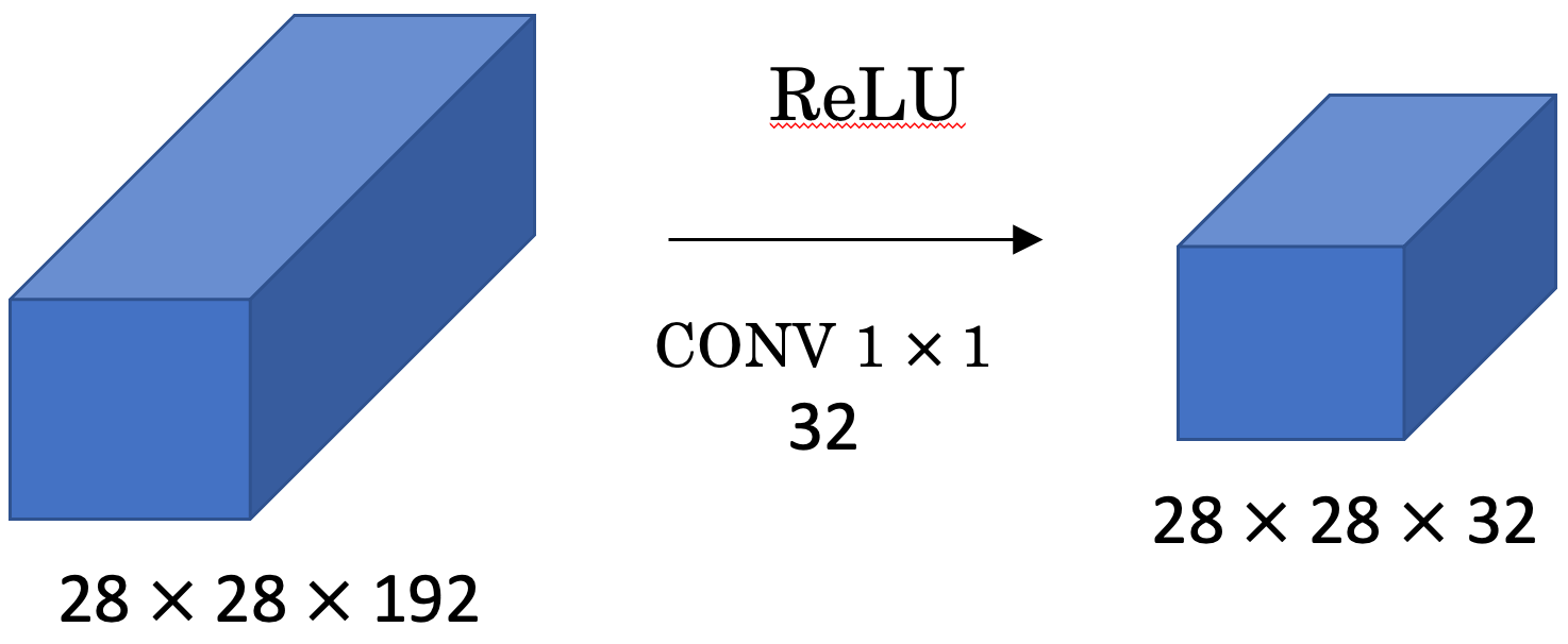 - 위 그림처럼, (28, 28, 192) 볼륨에 (1, 1, 192) 필터 블록을 32개 적용한다면, 출력 볼륨은 (28, 28, 32)가 됩니다.