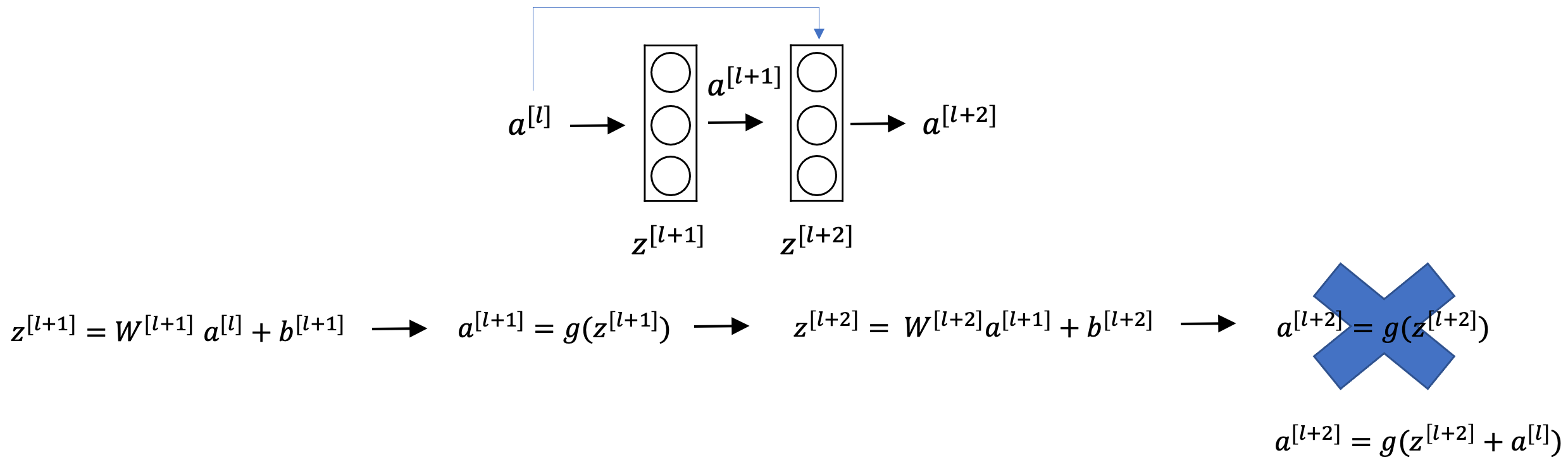 - a[l+2] = g(z[l+2]) 공식은 a[l+2] = g(z[l+2] + a[l]) 로 바뀌게 됩니다.