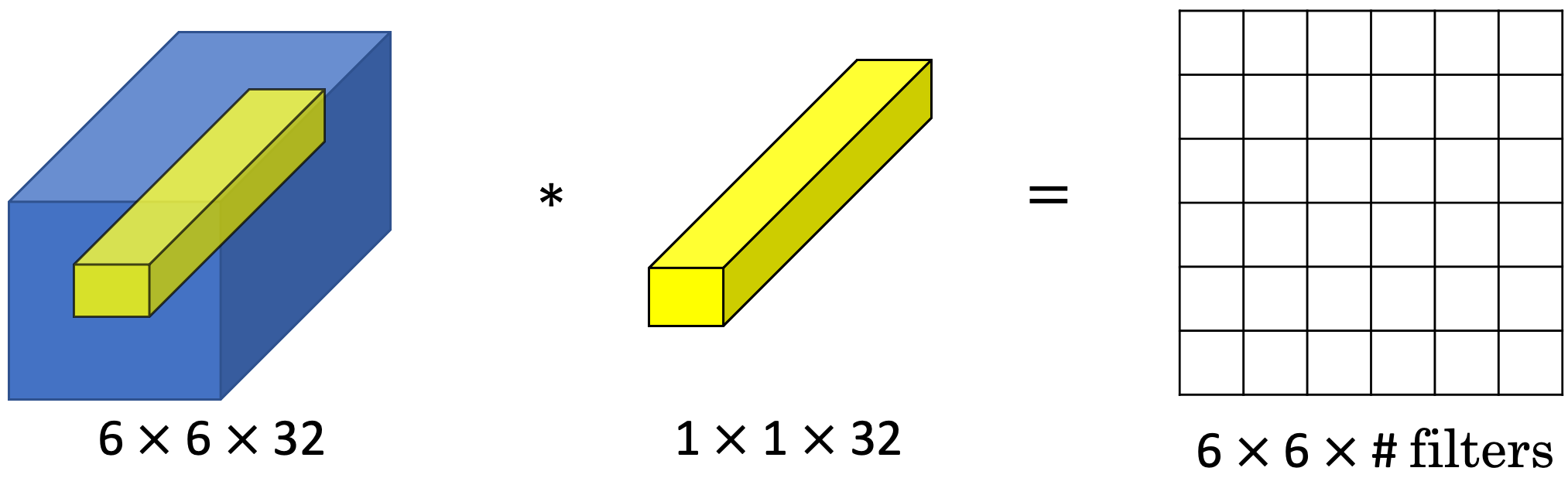 아래 그림은, (6, 6, 32) 볼륨에 (1, 1, 32) Convolution을 적용한 예제입니다.