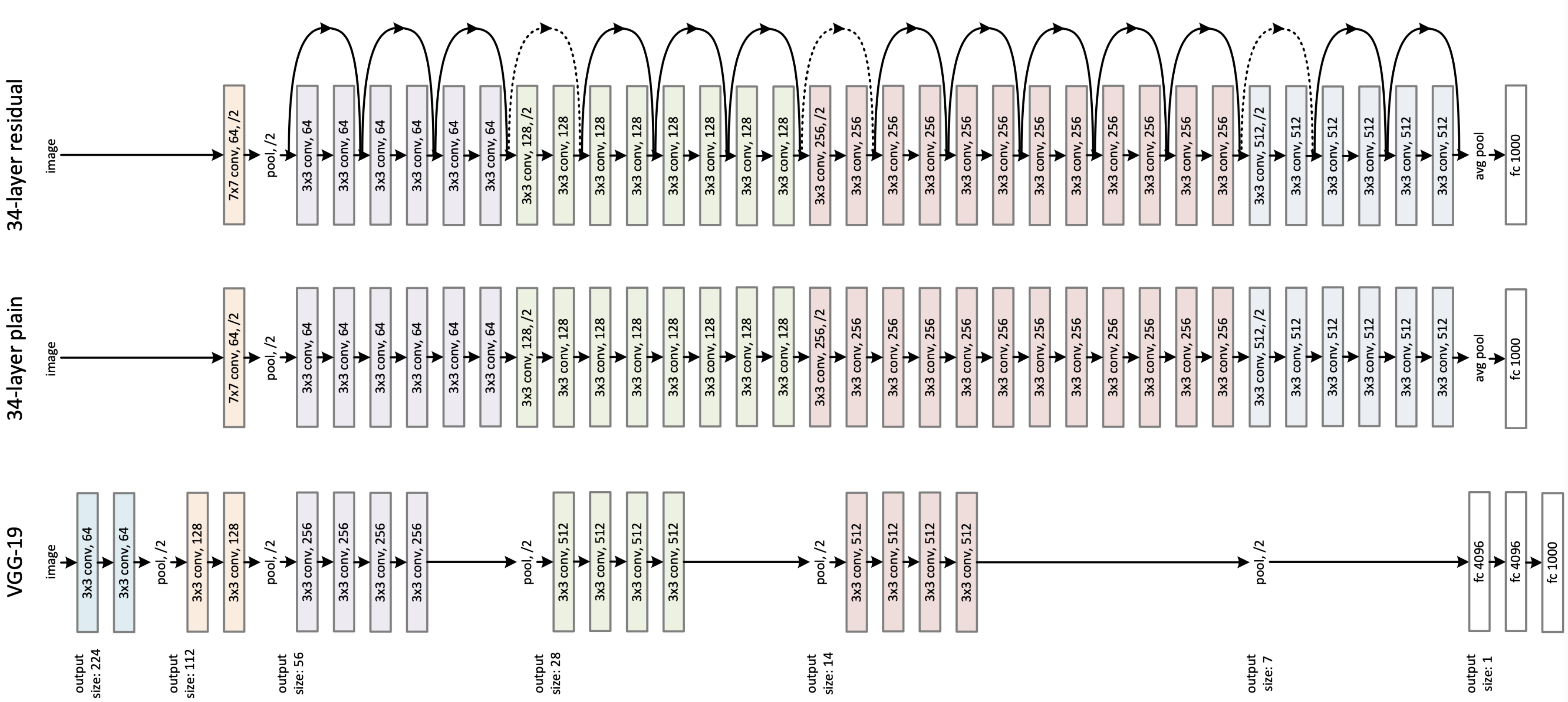 - VGG-19의 구조에 컨볼루션 층들을 추가해서 깊게 만든 후에, shortcut들을 추가하는 것이 사실상 전부입니다.