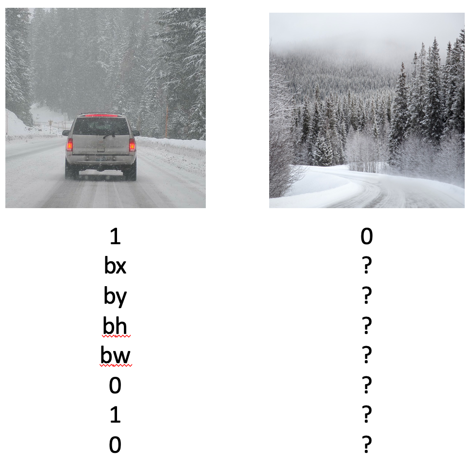 첫 번째로, Object가 있는 왼쪽 이미지를 input X로 받았을 때, y = [1, bx, by, bh, bw, 0, 1, 0] 으로 구성할 수 있습니다.