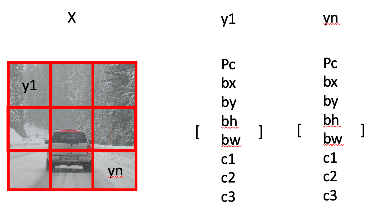 위 그림과 같이, Input X에 대한 Target Label y는 각 그리드 셀에 대해 Class Label(c1, c2, c3) 과 Bounding Box(bx, by, bh, bw) 로 구성됩니다.