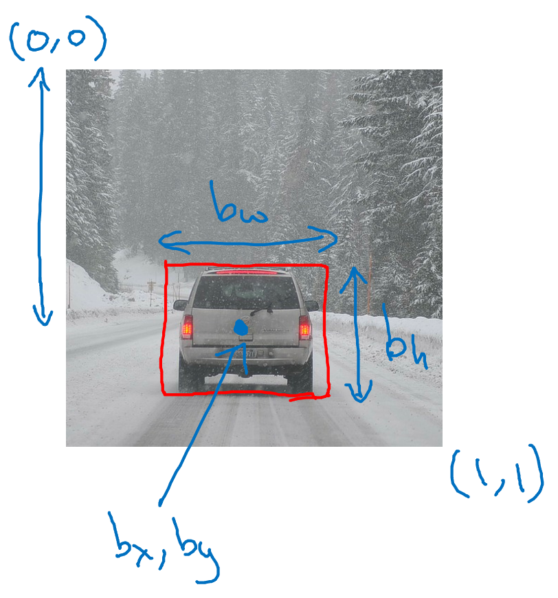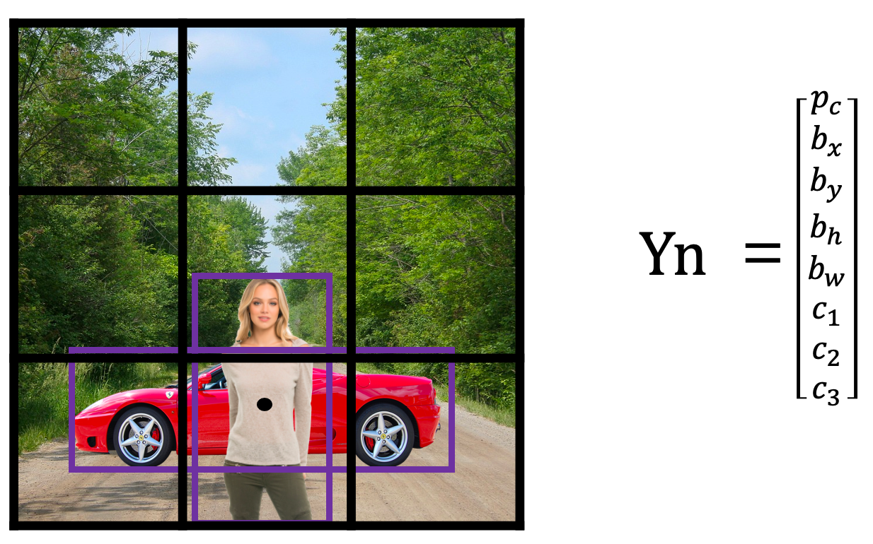 - 객체를 탐지한 그리드 셀은 y = [1, bx, by, bh, bw, 0, 1, 0] 가 될 것이며