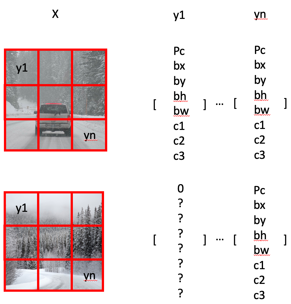 - 그리드 셀 내에 객체가 없기 때문에 Pc = 0 이 되고 나머지 원소는 어떤 값이 와도 의미가 없습니다.