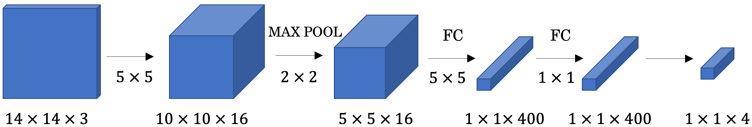 - 14 x 14 x 3 이미지를 ConvNet을 통해 Convolution하니 1 x 1 x 4 의 결과가 나옵니다.