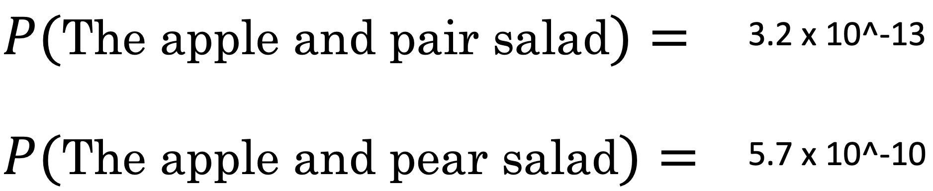 첫 번째 문장의 확률이 3.2 x 10^-13, 두 번째 문장의 확률이 5.7 x 10^-10이라면