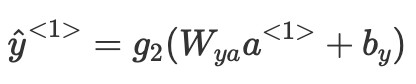 다음으로 첫번째 단어의 예측 y^<1>은 다음과 같이 구할 수 있다.