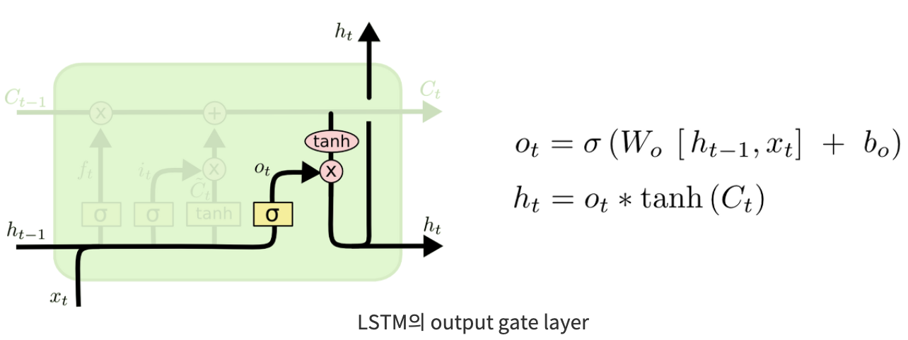 - output gate (o) : 최종 결과를 내보내기 위한 게이트