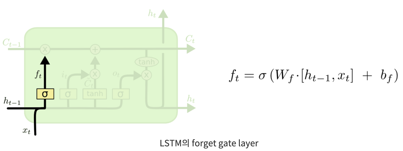 - forget gate (f) : 과거 정보를 잊기 위한 게이트