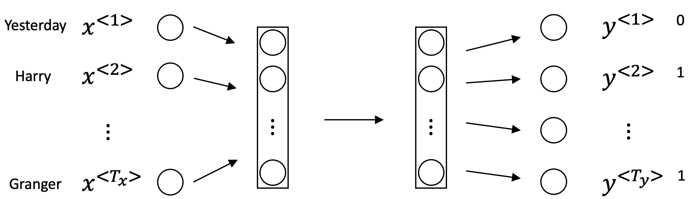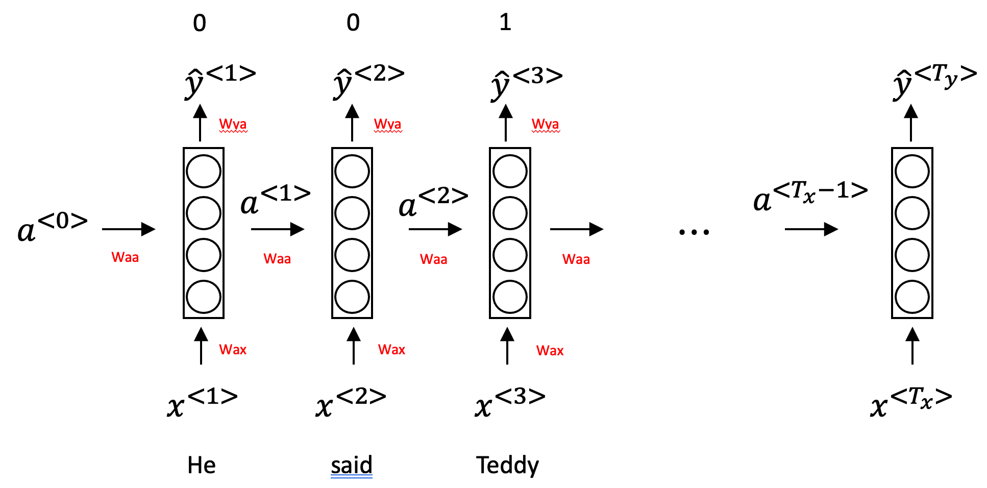 그리고 내부 신경망(hidden layer, output layer)를 통해, 해당 단어가 사람의 이름인지 y^<1>을 예측한다.
