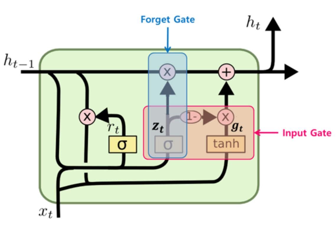 - LSTM의 forget gate, input gate와 비슷한 역할을 하며,
