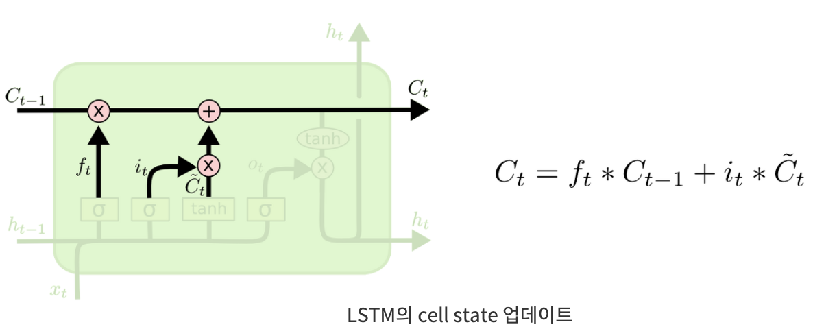 - 이전 cell state인 C(t−1)를 업데이트해서 새로운 cell state인 C(t)를 만드는 단계이다.