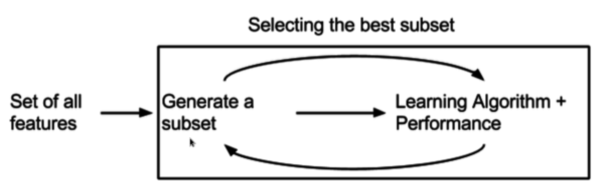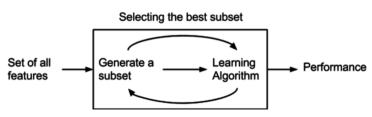 - Wrapper method는 예측 정확도 측면에서 가장 좋은 성능을 보이는 Feature subset(피처 집합)을 뽑아내는 방법입니다.