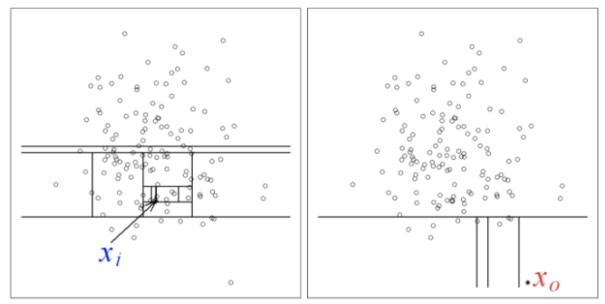 - 위 그림을 보면, 왼쪽 그림의 정상 데이터 Xi 는, 오른쪽 그림의 이상 데이터 Xo 보다 더 많은 분할로 나눠진 것을 알 수가 있다.