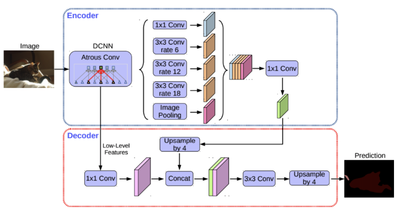 이번에 발표된 DeepLab V3+에서는 U-Net과 유사하게 intermediate connection을 가지는 encoder-decoder 구조를 적용하여, 보다 정교한 object boundary를 예측할 수 있게 됩니다