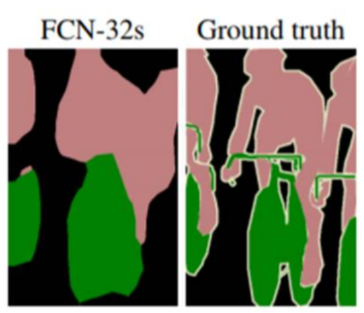 아래 그림을 보면, ground truth와 비교해, FCN-32s로 얻은 segmentation map은 많이 뭉뚱그려져 있고 디테일하지 못함을 알 수 있습니다.