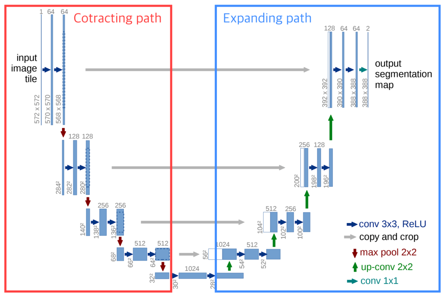 U-Net의 구조는 알파벳 U의 왼쪽 절반에 해당하는 Contracting Path와