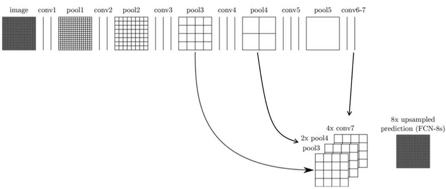 (pool3 + 2xpool4 + 4xcon7)을 8배 upsampling을 해 얻은 특성맵들로 segmentation map을 얻는 방법을 FCN-8s라고 부릅니다.