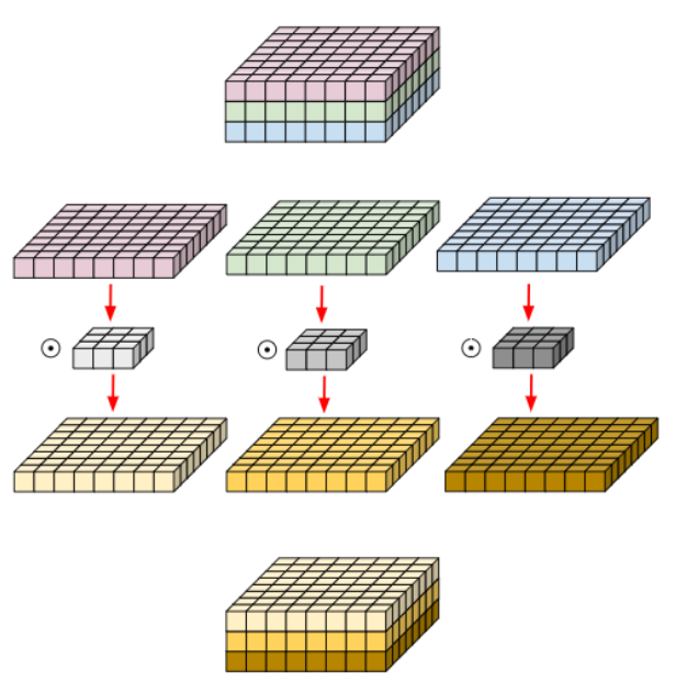 위 그림처럼, Convolution 연산에서 channel 축을 filter가 한 번에 연산하는 대신에,
