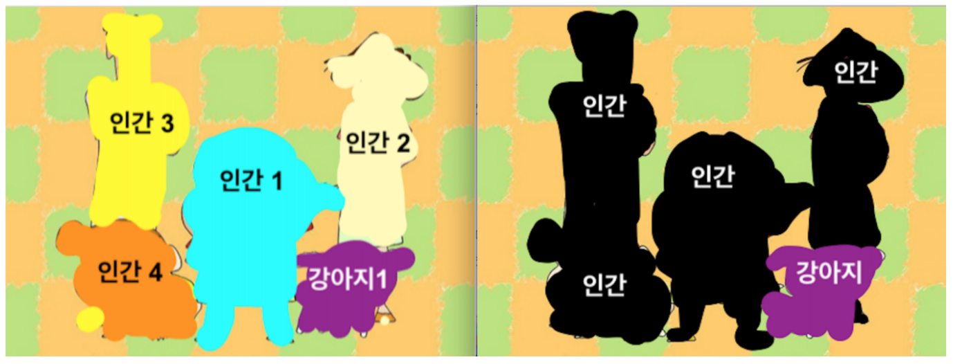 Instance Segmentation은 왼쪽처럼, 픽셀 단위로 어떤 class인지 구분한 이후, 동일한 class 내에서도 다른 Instance를 구분합니다.