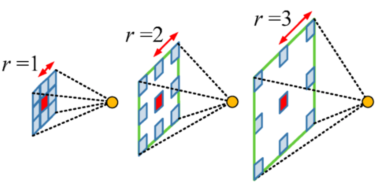 - 위 예시에서, 얼마나 빈 공간을 둘 지 결정하는 파라미터인 rate r=1일 경우, 기존 convolution과 동일하고, r이 커질 수록, 빈 공간이 넓어지게 됩니다.