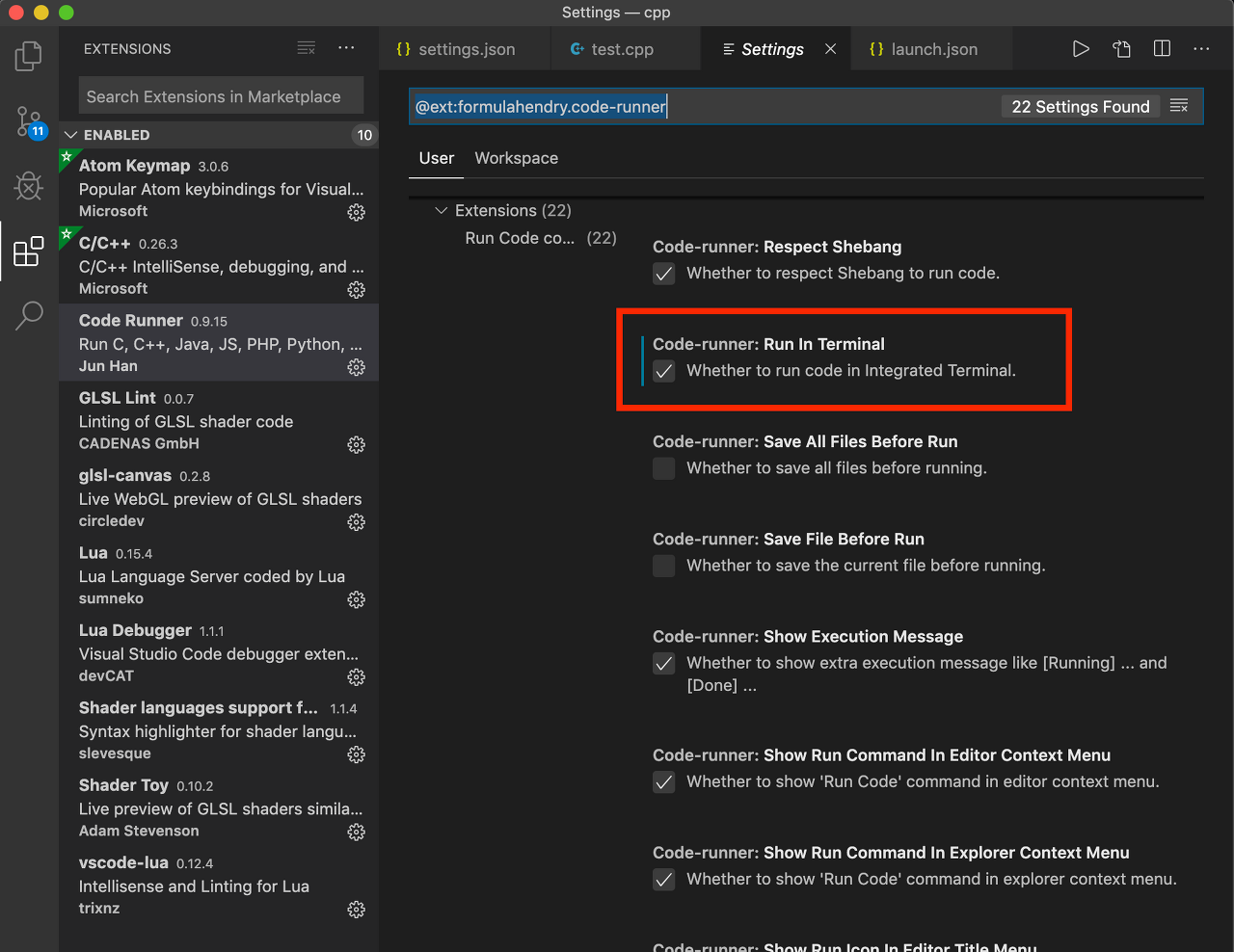 "code-runner.executorMap": { "javascript": "node", "php": "C:\\php\\php.exe", "python": "python", "perl": "perl", "ruby": "C:\\Ruby23-x64\\bin\\ruby.exe", "go": "go run", "html": "\"C:\\Program Files (x86)\\Google\\Chrome\\Application\\chrome.exe\"", "java": "cd $dir && javac $fileName && java $fileNameWithoutExt", "c": "cd $dir && gcc $fileName -o $fileNameWithoutExt && $dir$fileNameWithoutExt", "cpp": "cd $dir && g++ -std=c++14 $fileName -o $fileNameWithoutExt && $dir$fileNameWithoutExt" }- 전부 안해도 되고, cpp 만 할거면 cpp 부분 한 줄만 추가해도 된다.