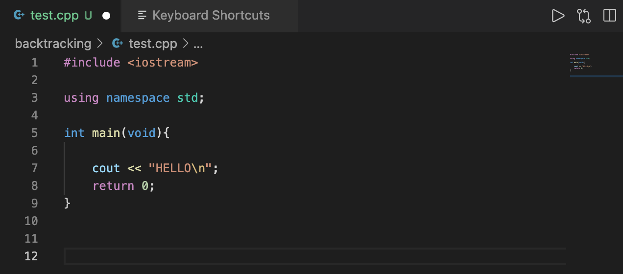 이후, cpp 파일을 생성하면, 우측 상단에 실행 버튼이 생긴다.