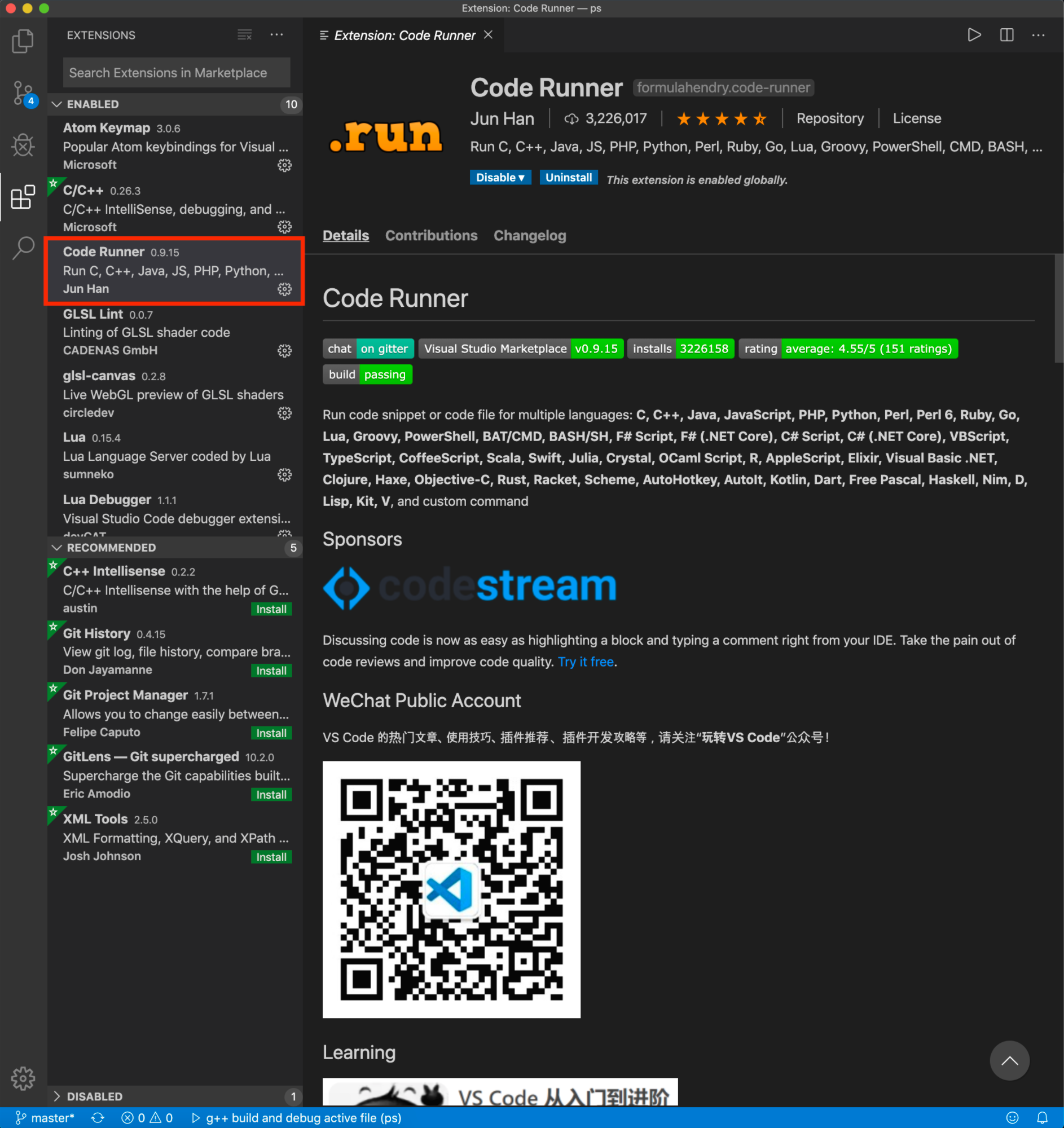 다음으로, Code Runner 를 검색해서, Jun Han 이라는 사람이 만든 Extension을 install 한다.