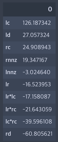 Feature = train[['lr','lc','rc','ld','rd','lnnz','rnnz','lr*lc','lc*rc','lr*rc']]