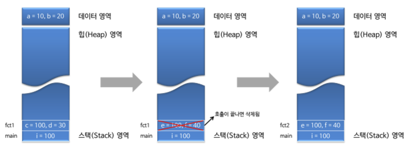 - fct1() 이라는 함수호출이 끝나면 c 와 d 는 스택영역에서 삭제되며,