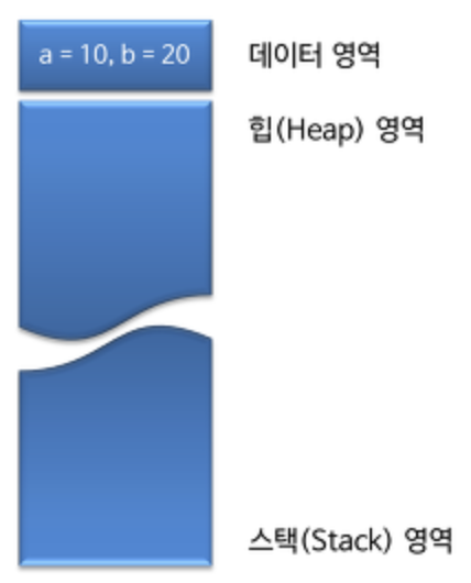#include <stdio.h> int a = 10; // 데이터 영역에 할당 int b = 20; // 데이터 영역에 할당 int main() { ... return 0; }- 위와 같은 프로그램 실행 시,