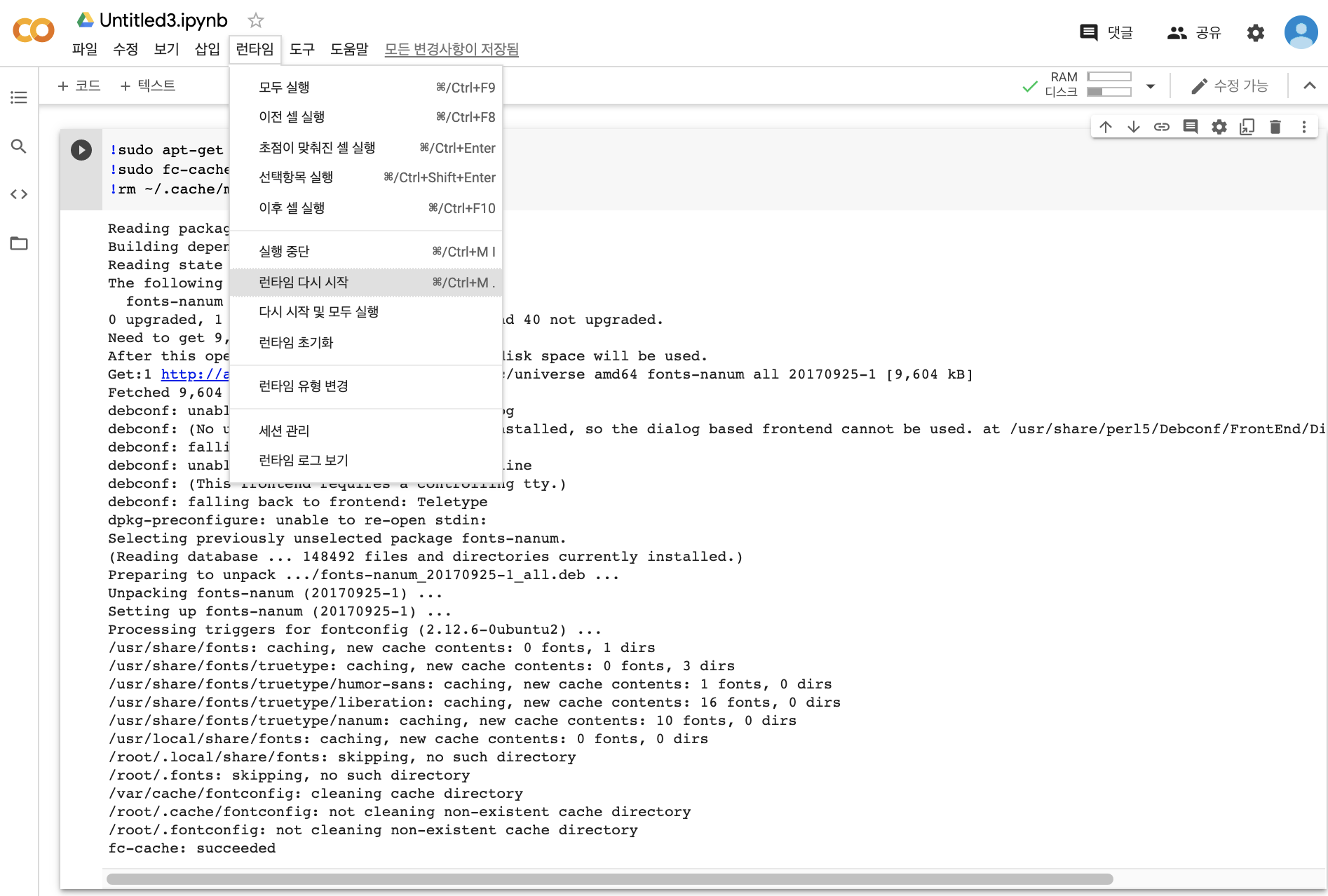 상단의 [런타임 - 런타임 다시 시작] 을 클릭하여 런타임을 재시작합니다.