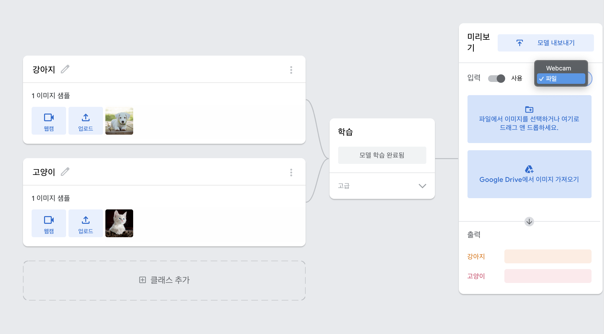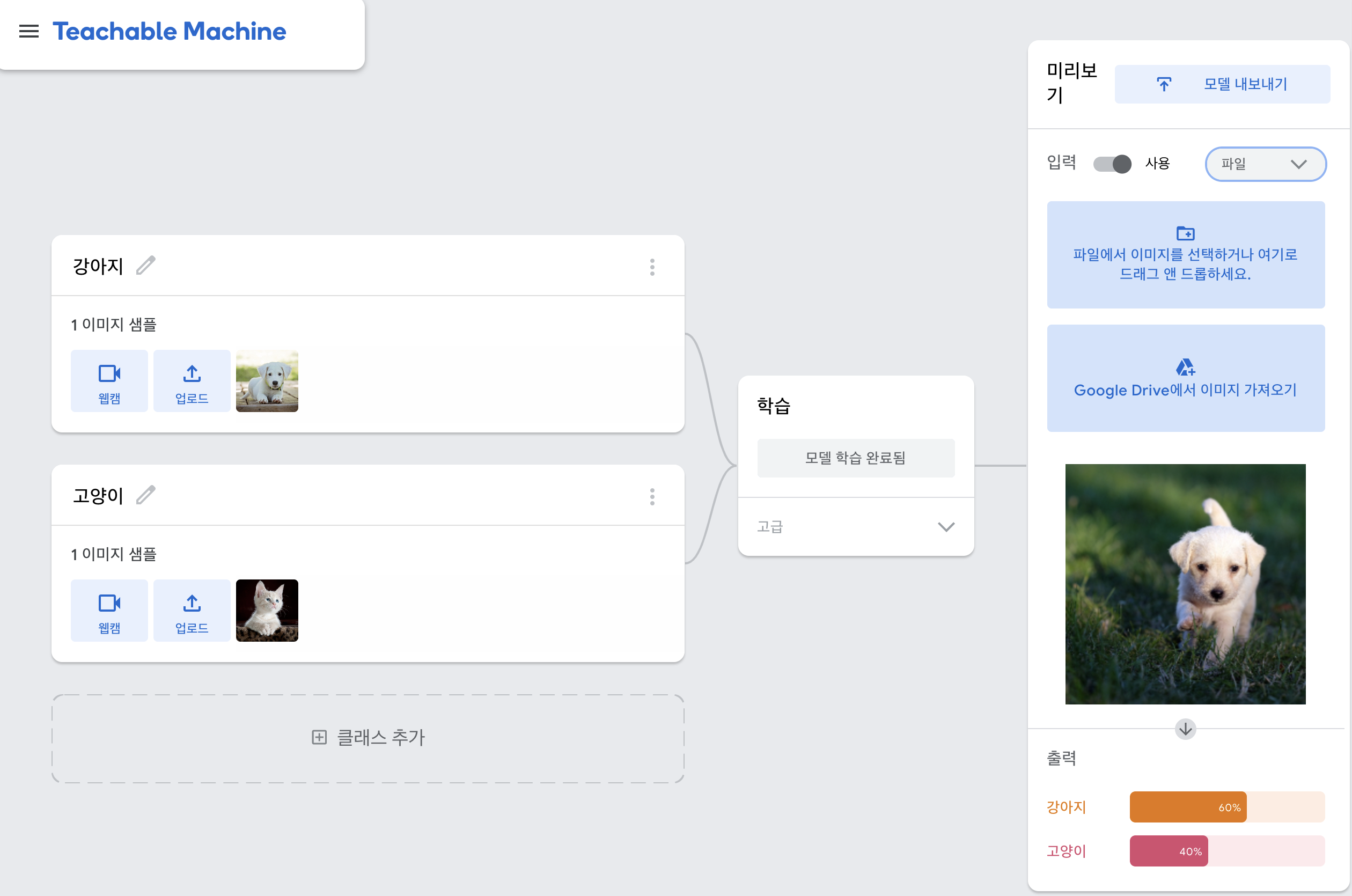 - 티처블 머신은 구글에서 제공하는 머신러닝 학습 도구이며,