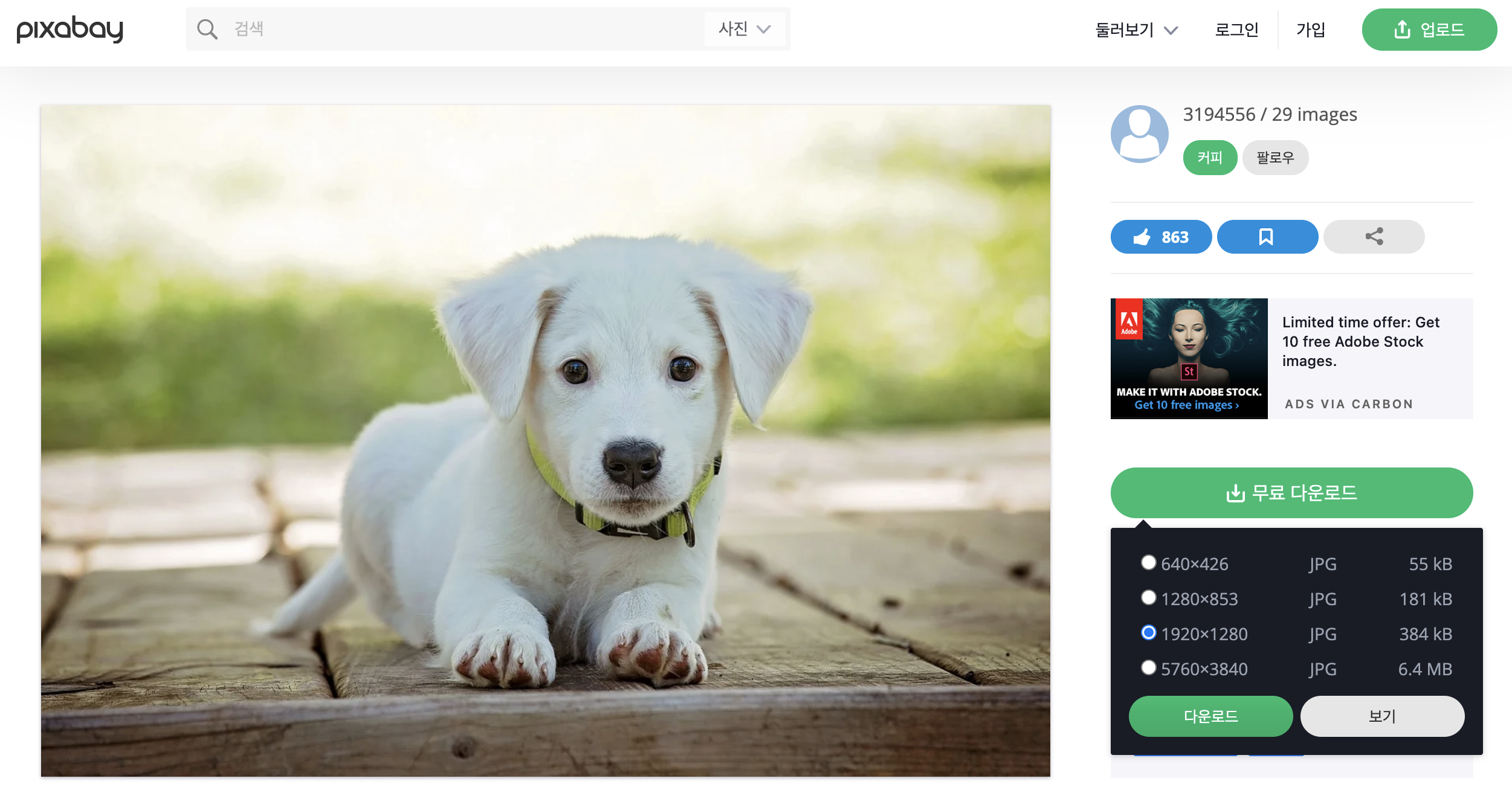 아래 링크를 통해, 강아지 이미지를 다운로드합니다. [무료]