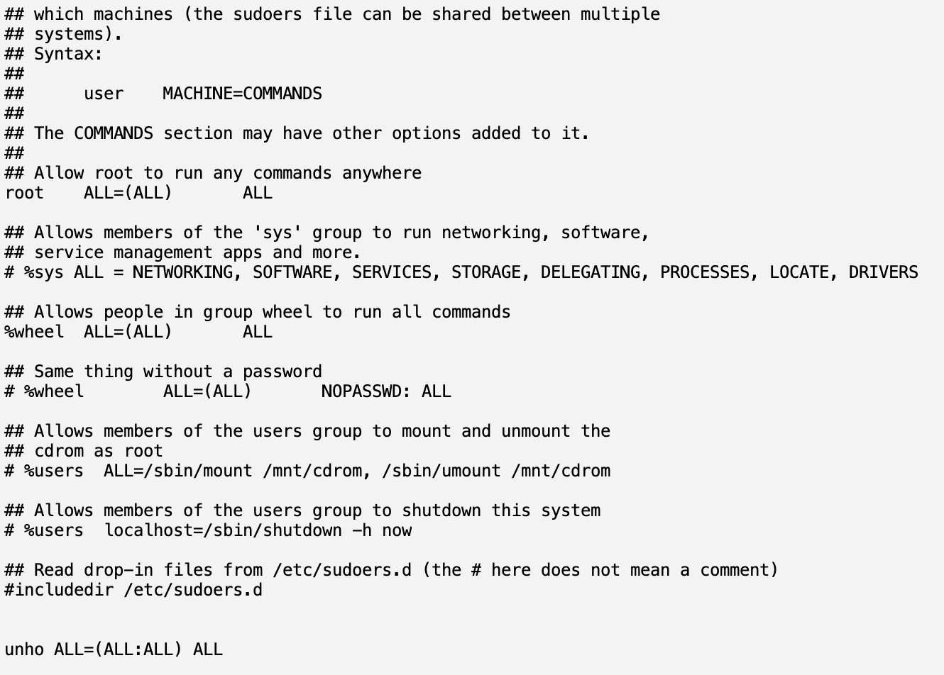 # 파일 권한 변경 sudo chmod u+w /etc/sudoers # 파일 접근 sudo vi /etc/sudoers맨 하단에 아래 내용 추가 (sudo 접근 가능하도록 설정)