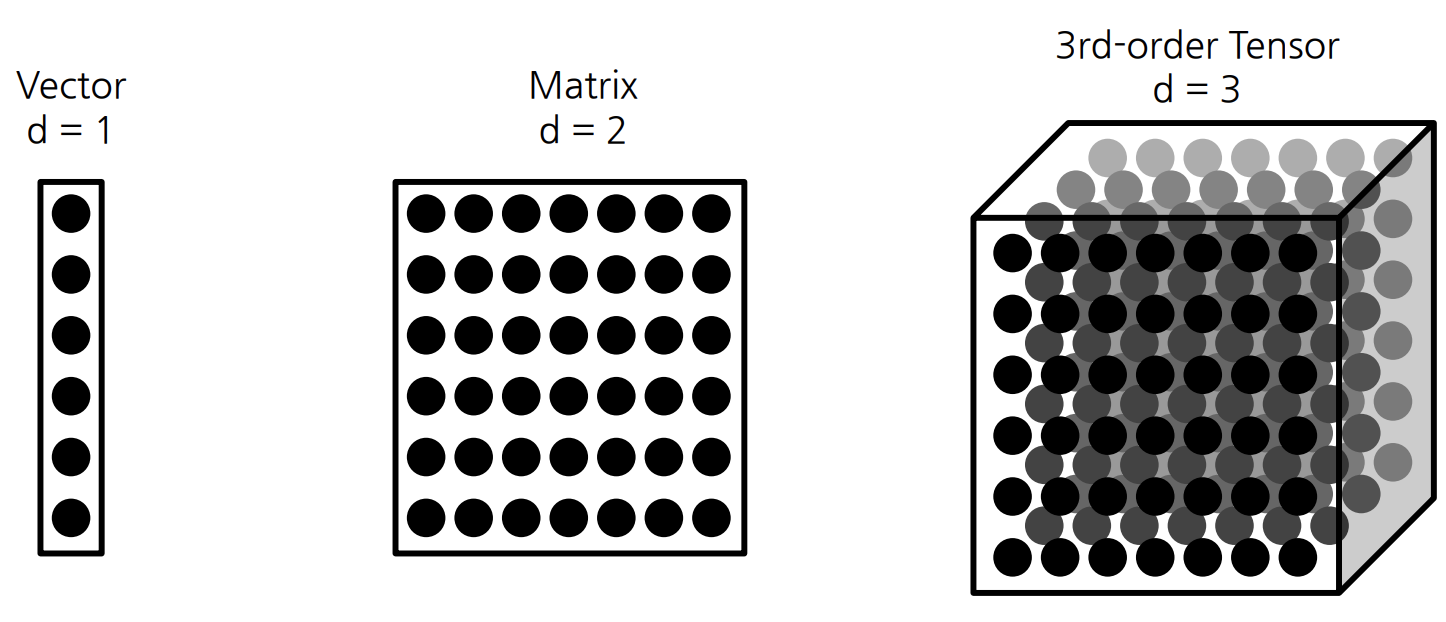 - d 가 3 이라면, Third Order Tensor 이며, 이는 Tensor 라고 불린다.