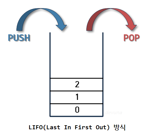 - 이러한 스택의 구조를 후입선출(LIFO, Last-In-First-Out) 구조라고 한다.