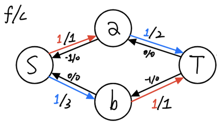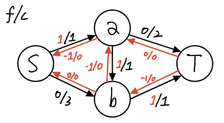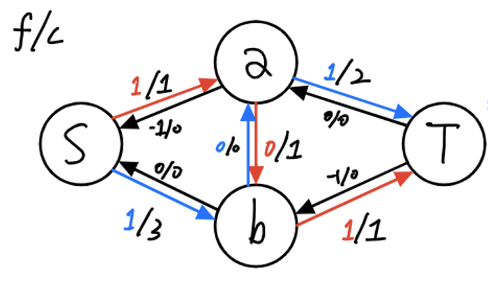 - 즉, b 에서 a 로, 1 만큼의 유량을 추가로 흘려보낼 수 있는 것을 알 수 있습니다.